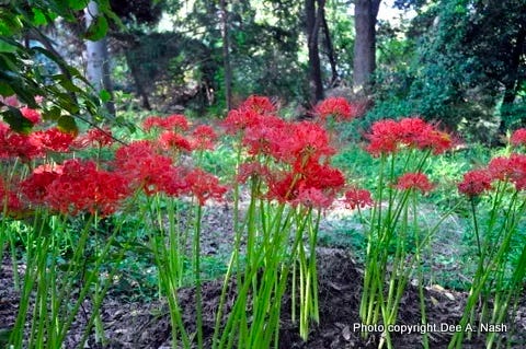 Anyway, while you ponder that, note the picture above is of Lycoris radiata, aka spider lilies which bloom in Dee’s garden in early fall.